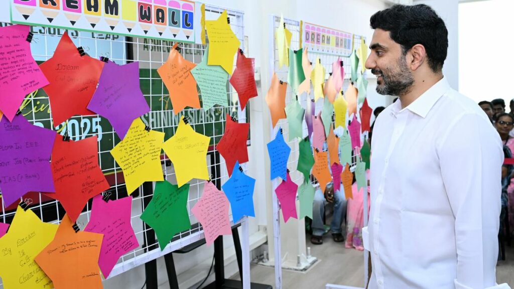 HRD Minister Nara Lokesh, looking at the ‘Dream Wall’, where students expressed their life goals at an event in Undavalli on Tuesday. Photo: Special arrangement